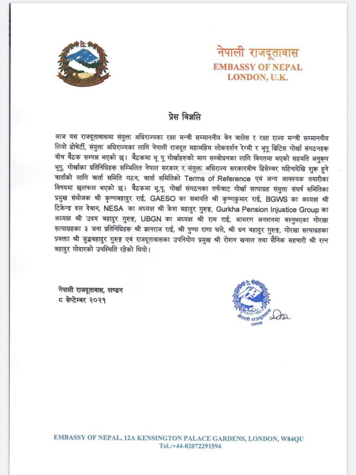 बैठकमा गोर्खाहरुको माग सम्बोधनका लागि आउँदो डिसेम्बर महिनाभित्रै शुरु गर्ने भनिएको वार्ताको तयारीका विषयमा छलफल भएको लन्डनस्थित नेपाली दूतावासले जनाएको छ ।