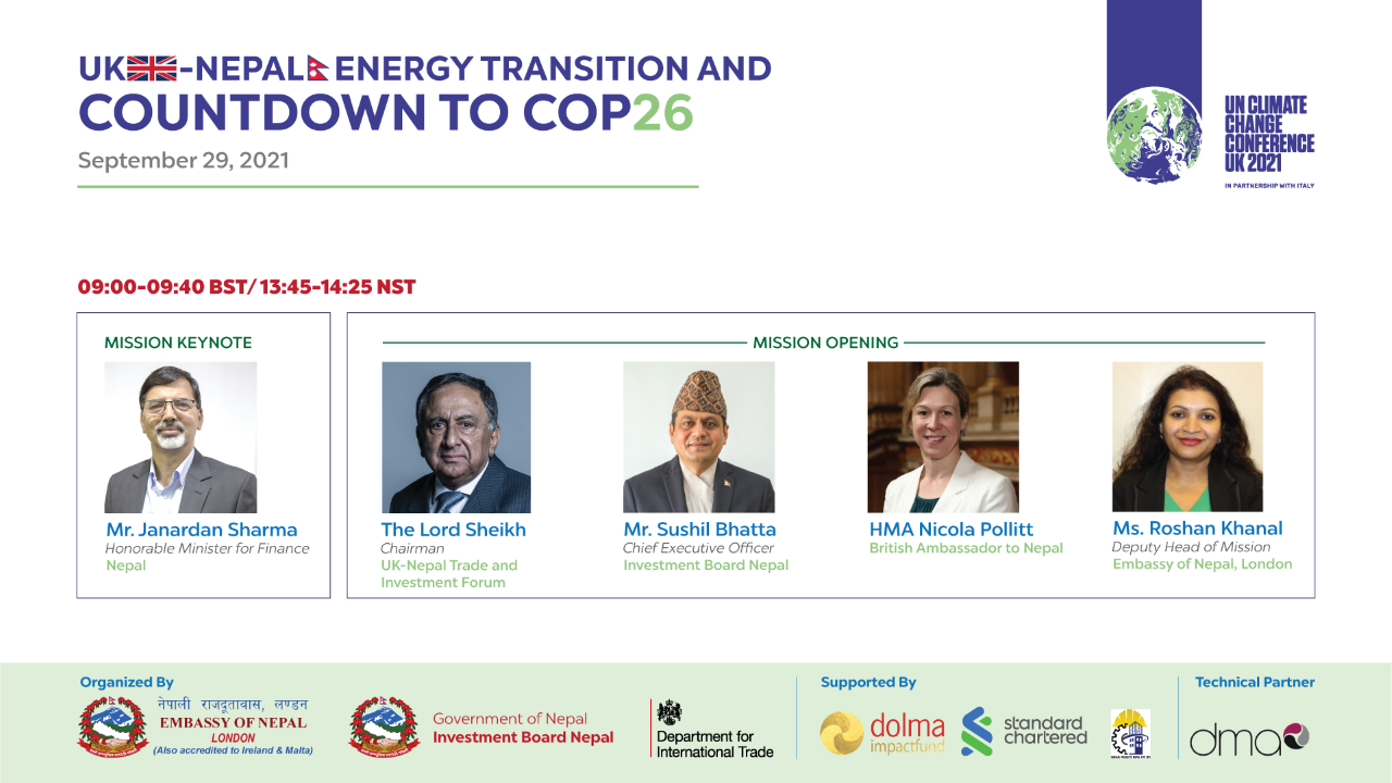 नेपाली दूतावास लण्डन, लगानी बोर्ड नेपाल, नेपालस्थित ब्रिटिश राजदूतावास र डेभलपिङ मार्केट एसोसिएटस (डीएमए) को संयुक्त आयोजनामा ‘यूके नेपाल इनर्जी ट्रान्जिसन् एन्ड काउन्टडाउन टु कोप २६’ विषयक लगानी सम्मेलन सम्पन्न भएको हो ।
