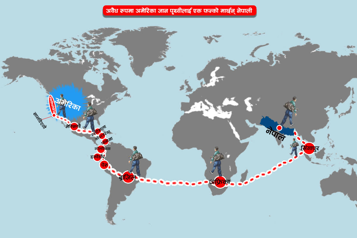 विश्वका कुनै पनि मुलुकबाट अवैध रूपमा अमेरिका छिर्न दक्षिण अमेरिकाका ब्राजिल, बोलिभिया, सुरिनाम, गुयना, पेरु वा चिलीमध्ये कुनै एक मुलुकमा हवाइ मार्गबाट पाइला राख्नैपर्छ । ल्याटिन अमेरिका पुगेपछि जसरी भए पनि त्यहाँबाट अमेरिका पुग्नैपर्छ भन्ने मानसिक दबाब त्यहाँ आइपुगेका नेपाली युवाहरूलाई हुन्छ किनभने उनीहरू दलाललाई लाखौं रकम बुझाएर आएका हुन्छ ।