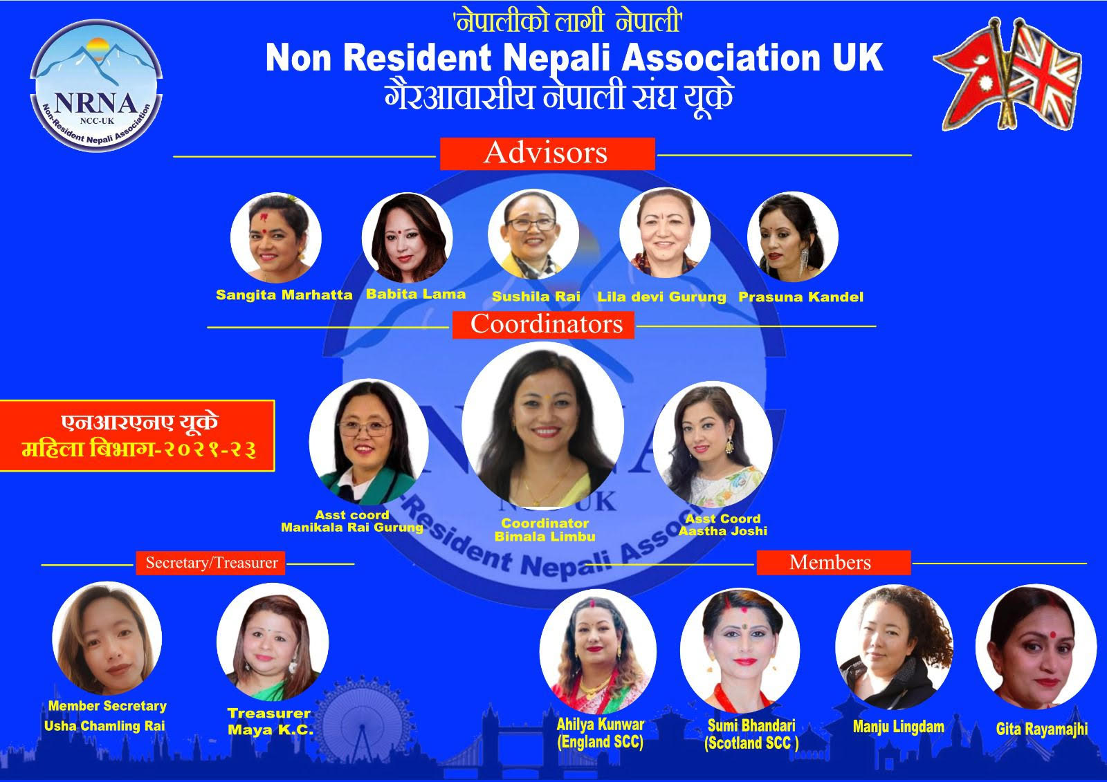 महिला बिभागको सदस्यहरुमा एनआरएनए यूके इङल्याण्ड राज्य परिषद सहसचिव अञ्जू कुँवर, सुमी भण्डारी, मञ्जू लिङदम र गीता रायमाझी रहेका छन् ।