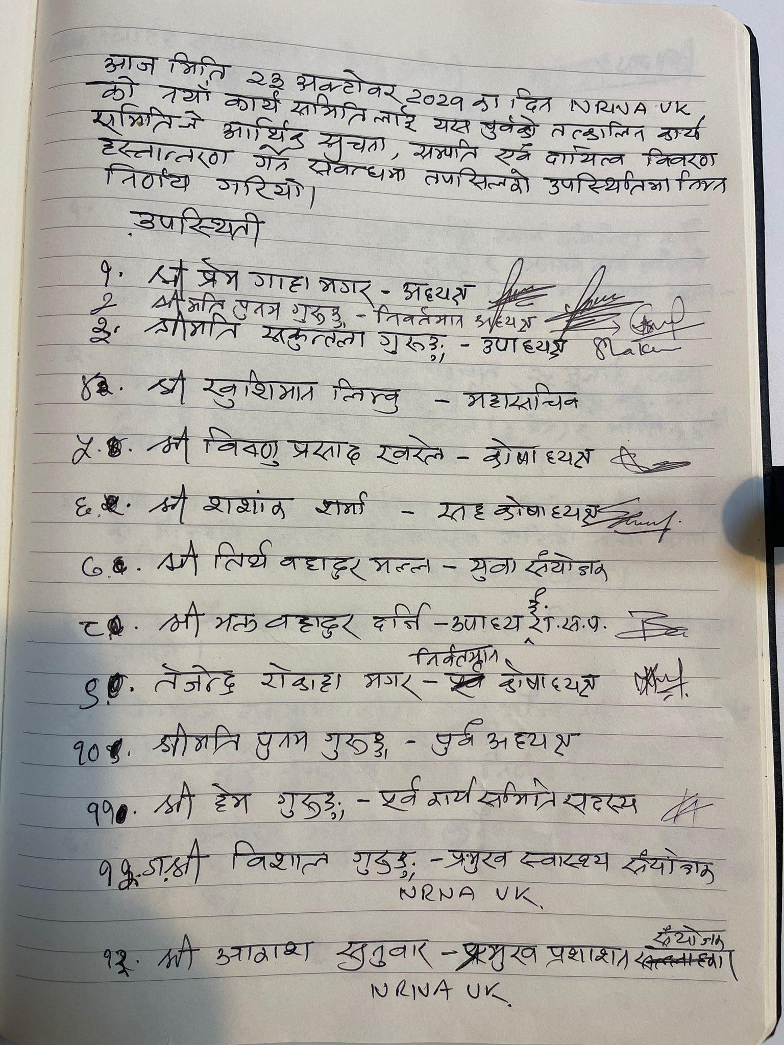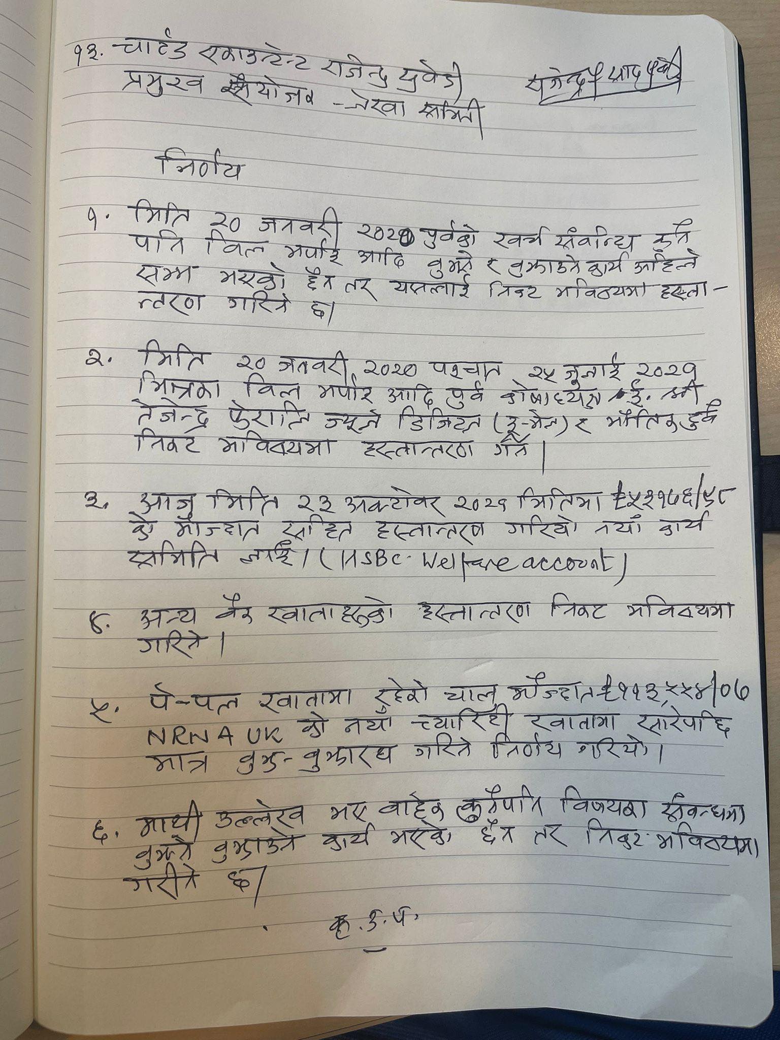 २३ अक्टोबरमा नयां र पुरानो कार्य समितिको हस्तान्तरण बैठकमा एचएसविसी वेलफेयर बैक तुरुन्त हस्तान्तरण गर्ने, अन्य बैकहरु र नगद समेत छिट्टै हस्तान्तरण गरी पुर्ण रुपमा बुझबुझारथ गर्ने र आजसम्म नवुझाइएका कागजातहरु समेत छिट्टै बुझाउने भन्ने सहमति भएको थियो ।