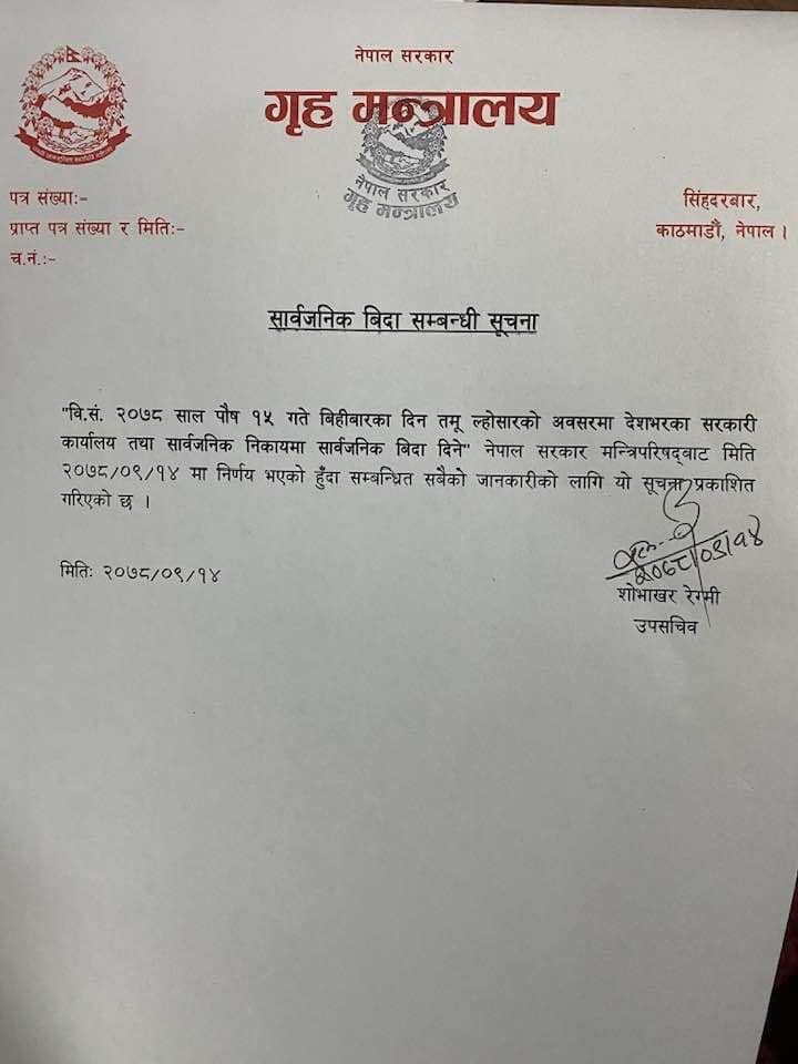 बुधबार अपरान्ह बसेको मन्त्रिपरिषद् बैठकले तमु ल्होसारको अवसरमा पुस १५ गते अर्थात भोली विदा दिने निर्णय गरेको मन्त्री शशी श्रेष्ठले जानकारी दिइन् ।।
