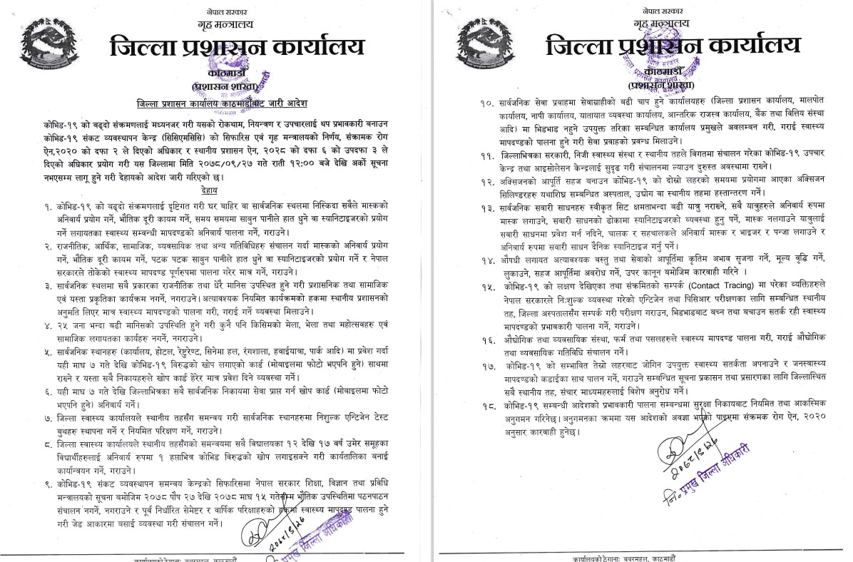 आदेश अनुसार घर बाहिर वा सार्वजनिक स्थलमा निस्कँदा सबैले अनिवार्य मास्कको प्रयोग गर्ने, भौतिक दूरी कायम गर्ने, साबुन पानीले हात धुनेलगायत स्वास्थ्य मापदण्ड पालना गर्न भनिएको छ।