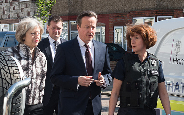 Home Secretary Theresa May and Prime Minister David Cameron talk to Immigration Enforcement officers after the officers raided residential properties looking for illegal immigrants in Southall