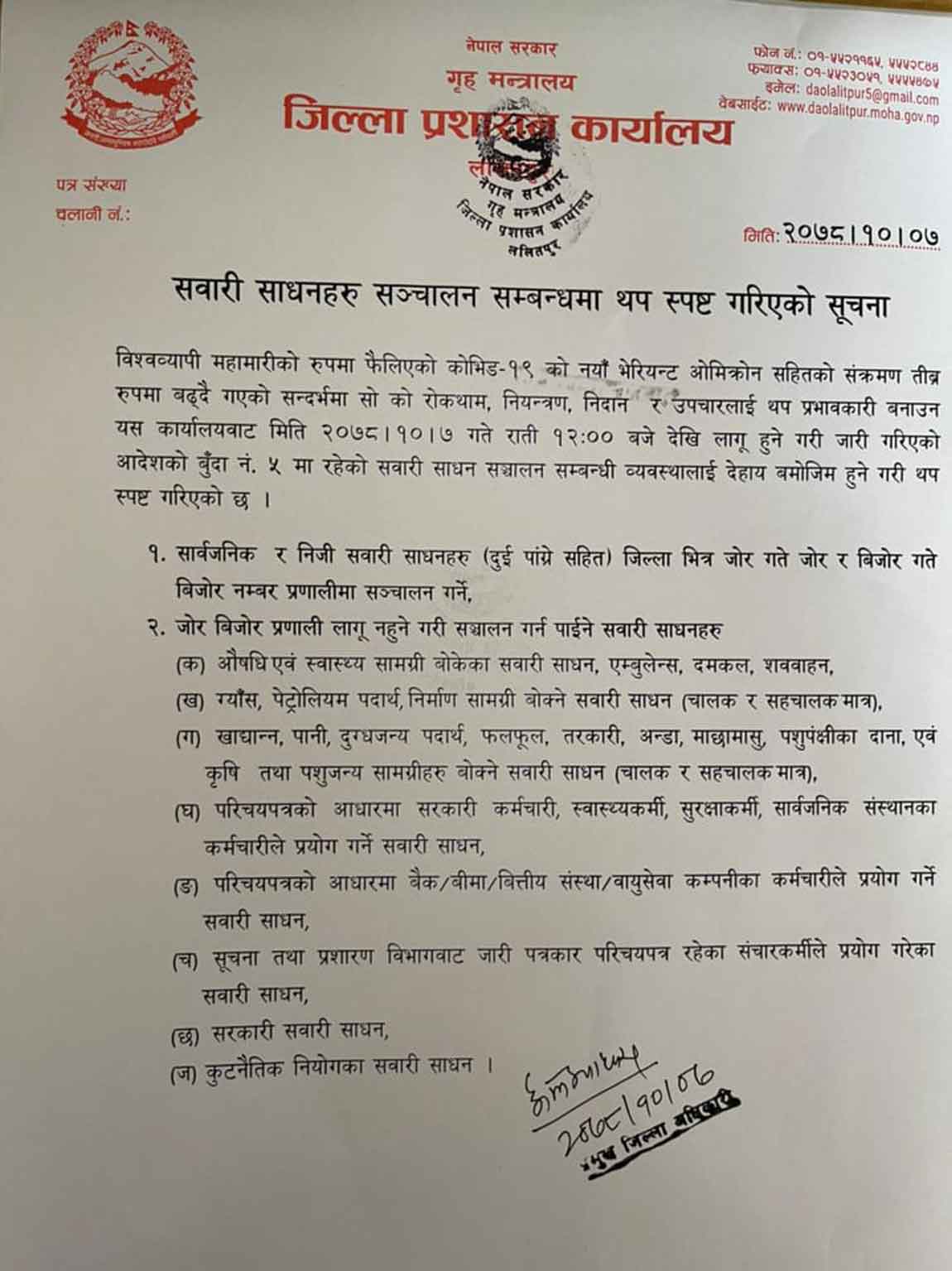 यता, परिचयपत्रको आधारमा सरकारी कर्मचारी, स्वास्थ्यकर्मी, सुरक्षाकर्मी, सार्वजनिक संस्थानका कर्मचारीले सवारी चलाउन पाउनेछन्। यस्तै, बैंक, बीमा, वित्तिय संस्था र वायुसेवा निगमका कर्मचारीले पनि परिचय पत्र देखाएर सवारी चलाउन पाउनेछन्।