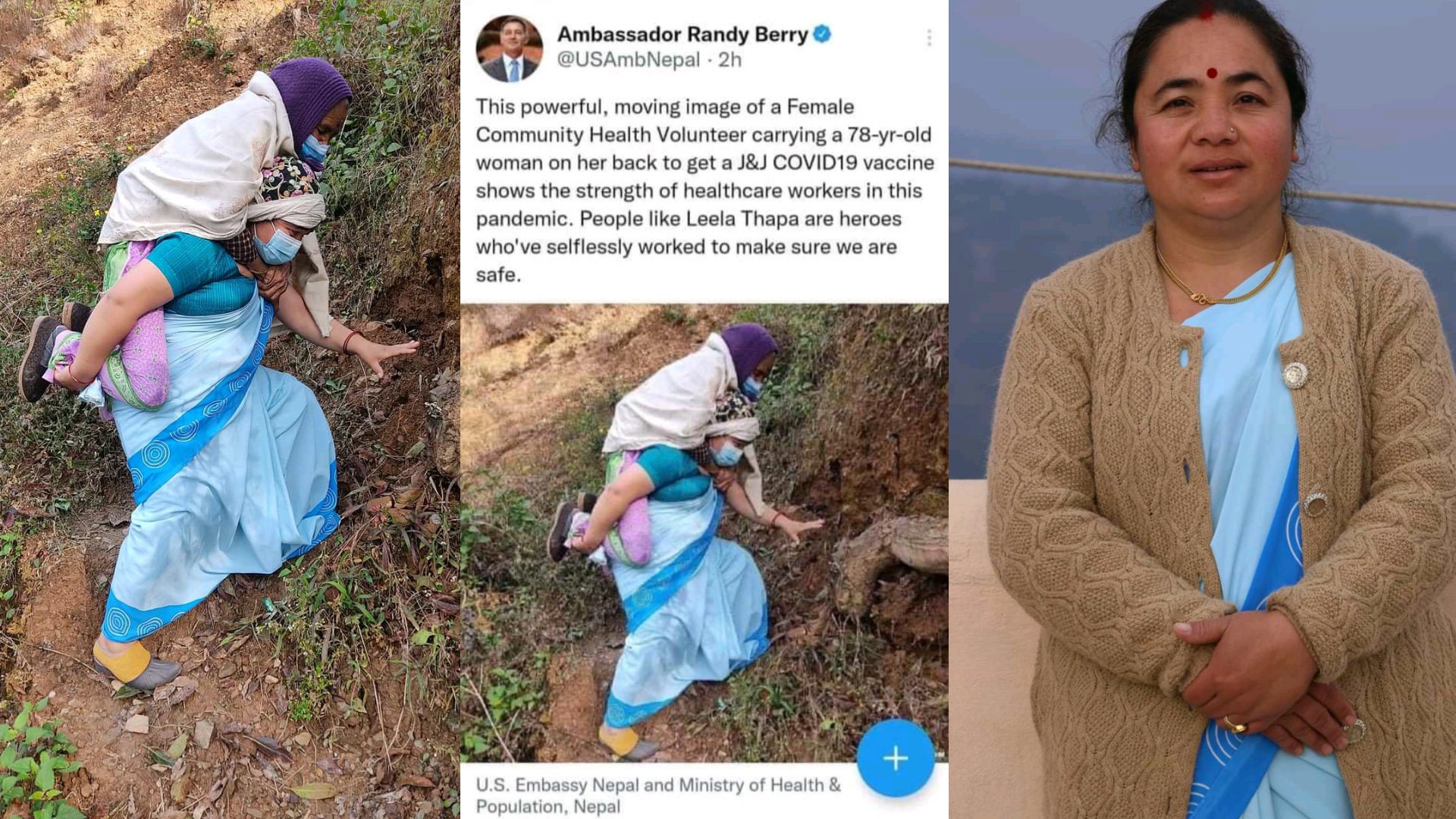 उक्त तस्बिरमा चर्चामा आएकी पात्र हुन् गुल्मी दरबार गाउँपालिकाकी ४२ वर्षीय महिला स्वंय सेविका लिला थापा । माघ १४ गते गुल्मीदरबार गाउँपालिका-३ की ७८ वर्षीया वृृद्धा देवकला टण्डनलाई पिठ्युँमा बोकेर उनले कोभिड-१९ विरुद्धको खोप लगाउन लग्दै थिईन् ।