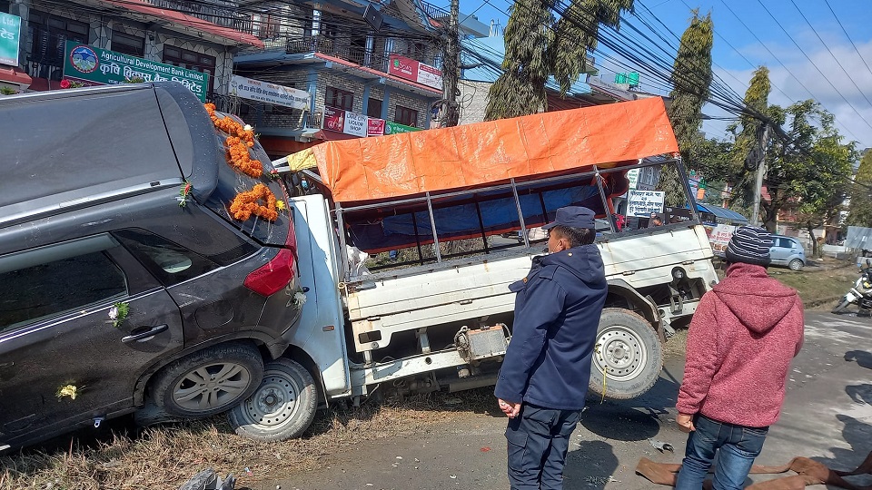 पोखरा। स्याङ्जाबाट नवलपुरको गैंडाकोट दुलही लिन गएको कार पोखराको तालचोक सडकखण्डमा दुर्घटनामा परेको छ । बेहुला चढेको ग २ च ८५५२ नं.को कार र ग २ च ३११७ नं. को जीप दुर्घटनामा परेका हुन् ।