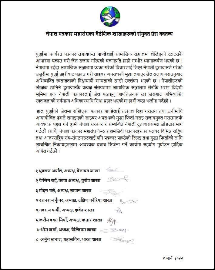 महासंघका विभिन्न सात वैदेशिक शाखाले बिहीबार संयुक्त वक्तव्य जारी गर्दै पाण्डेलाई अन्यायोचित ढंगले जेल हालिएकोमा कडा भर्त्सना गरेका छन् ।