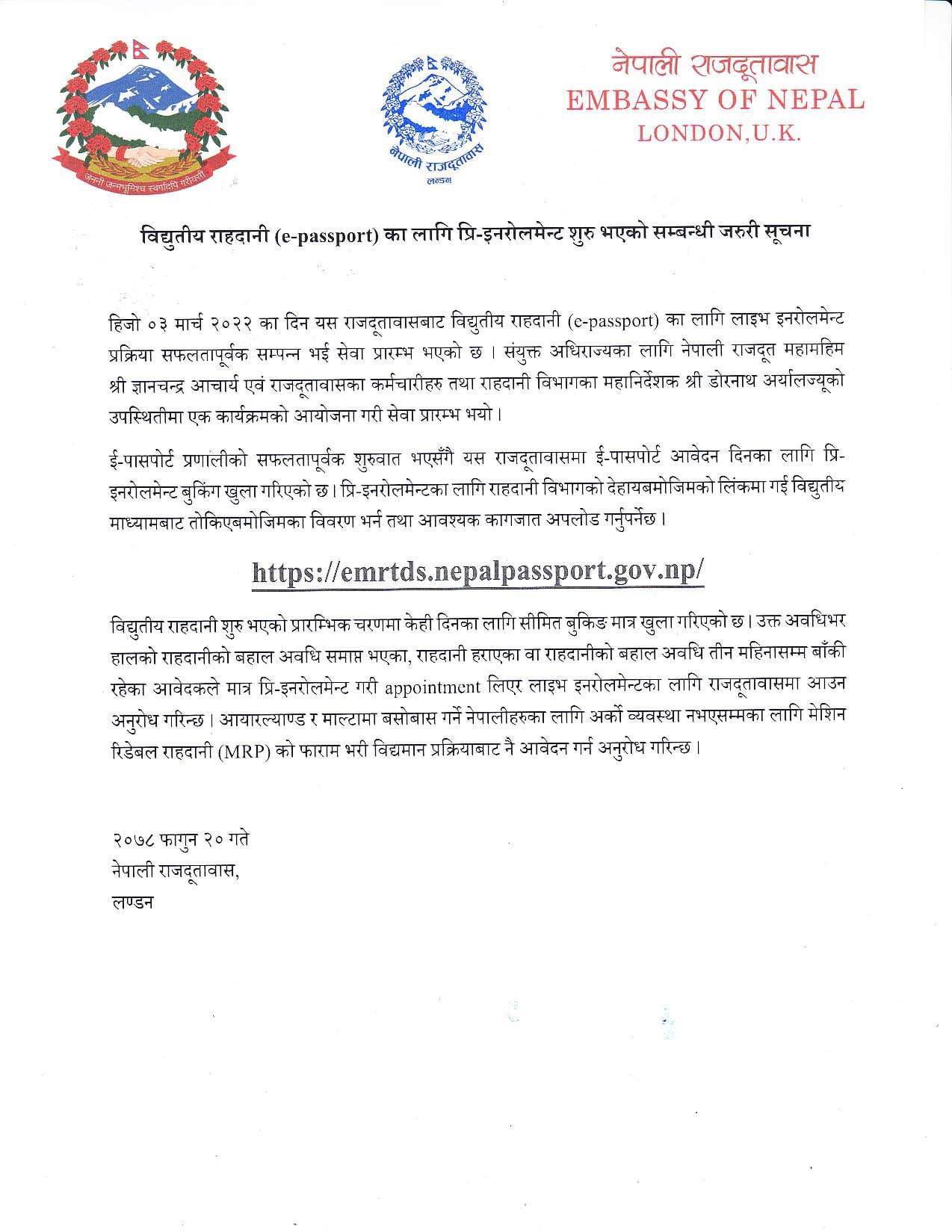 दूतावासले एक सूचना जारी गर्दै मार्च ३ बाट विद्युतीय राहदानीको लाइभ ईनरोलमेन्ट प्रक्रिया सफलतापूर्वक सम्पन्न भई सेवा प्रारम्भ भएको जनाएको छ । बेलायतका लागि नेपाली राजदुत ज्ञानचन्द्र आचार्य, एवम् राजदुतावासका कर्मचारी,दूतावासकी उपनियोग प्रमुख रोशन खनाल साथै दूतावासका अधिकारी र राहदानी विभागका महानिर्देशक डोरनाथ अर्यालको उपस्थितिमा विद्युतिय राहदानी सेवा सुरु गरिएको हो ।