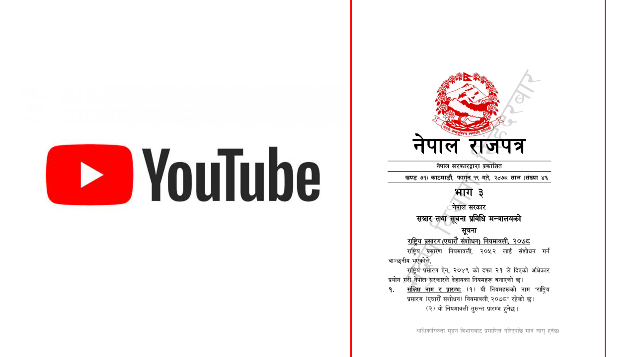 सञ्चार तथा सूचना प्रविधि मन्त्रालयले राष्ट्रिय प्रशारण नियमावलीको एघारौं संशोधन गर्दै युट्युब च्यानल र इन्टरनेटको माध्यमबाट हुने प्रशारणको नियमन र अनुगमन गर्ने व्यवस्था गरेको हो । नियमावली संशोधन गर्दै युट्युब र सोही प्रकारका अन्य प्रसारणहरूलाई पहिलोपटक कानुनी दायरामा ल्याएको हो ।