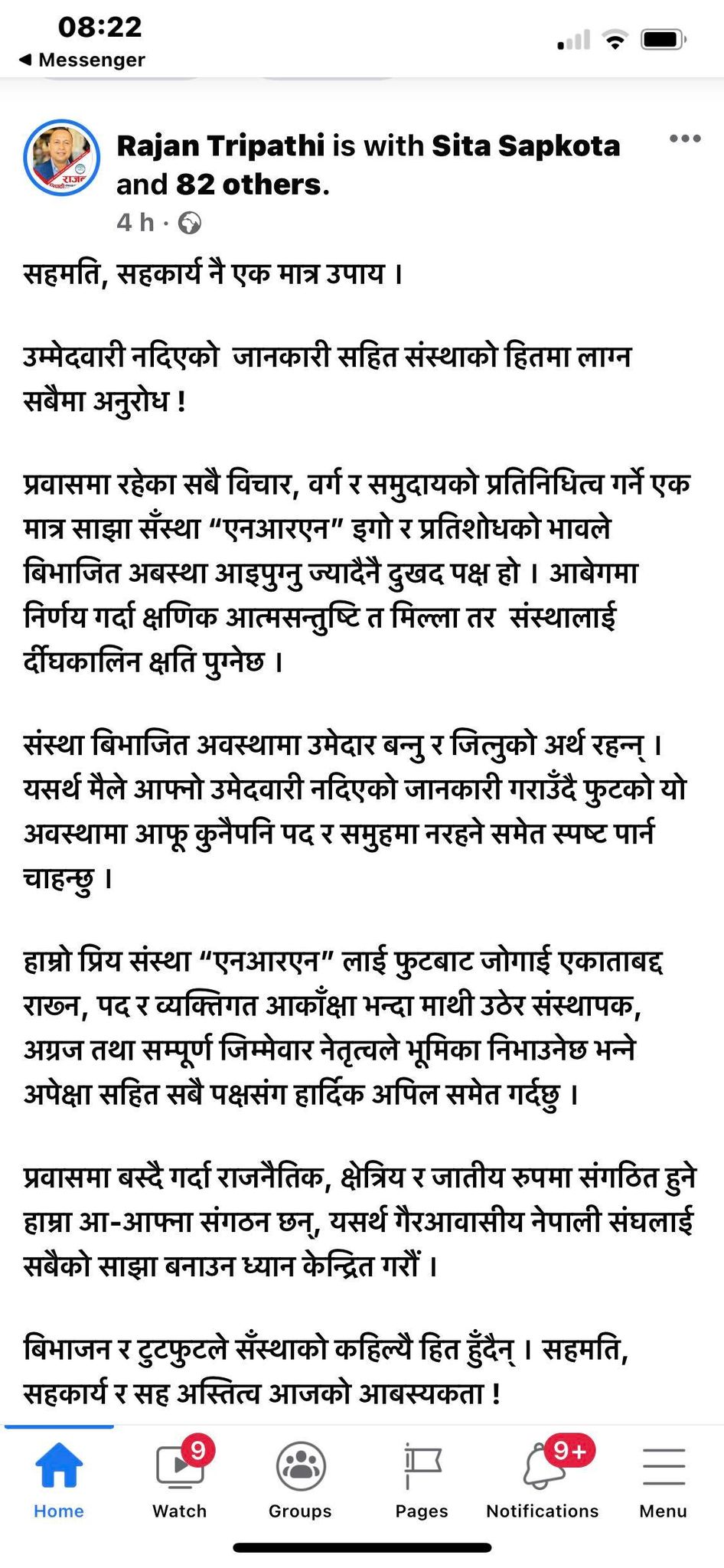 त्रिपाठीले सामाजिक सञ्जालमा एक सामाग्री पोष्ट गर्दै प्रवासमा रहेका सबै विचार,वर्ग र समुदायको प्रतिनिधित्व गर्ने एक मात्र साझा संस्था भएपनि पछिल्लो समय एनआरएनमा गुट र फुटले विभाजनको स्थिति निम्ताएको बताएका छन् ।