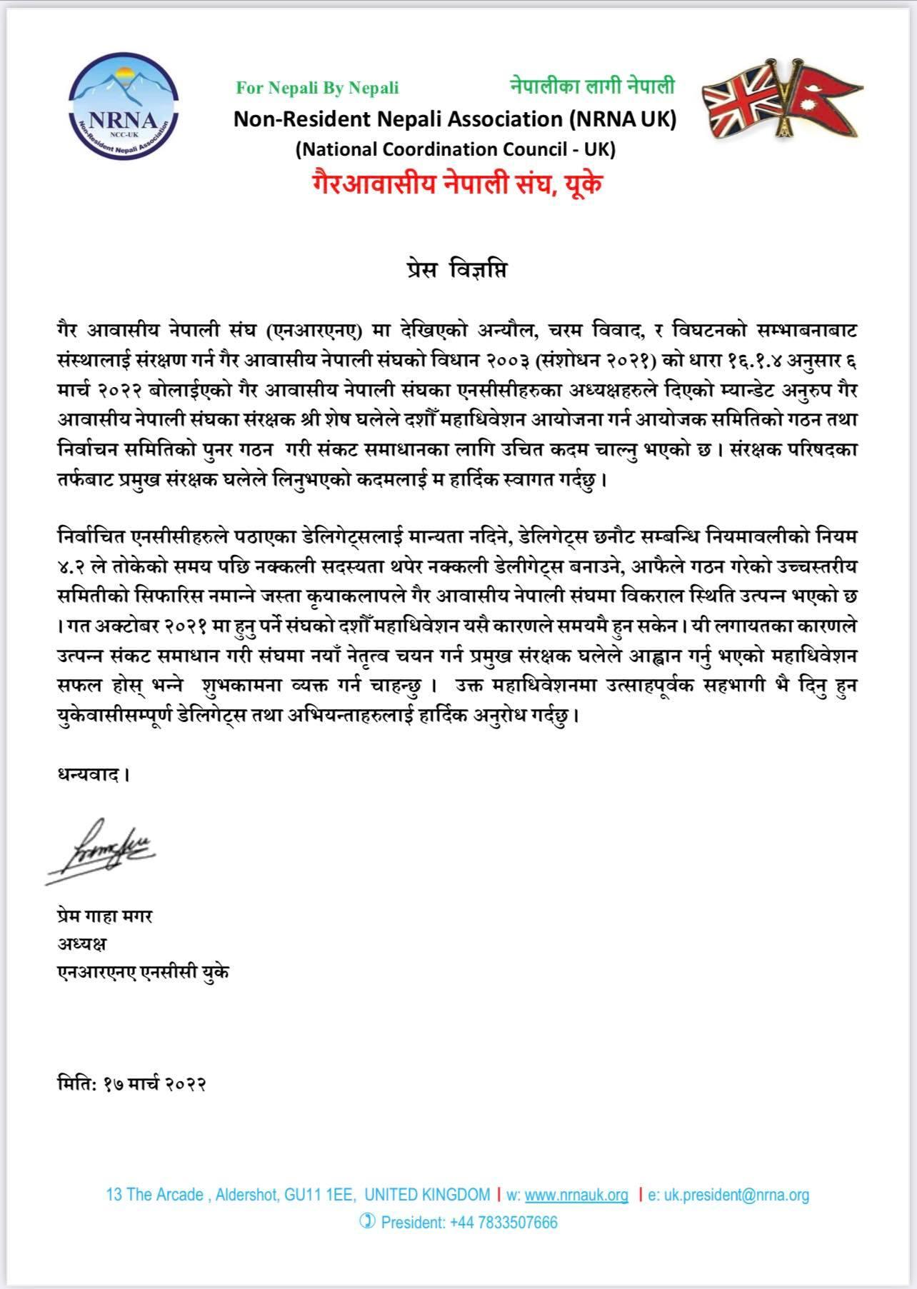 एनआरएन युकेले गर्यो शेष घलेले बोलाएको महाधिवेशनको स्वागत