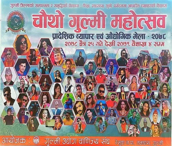 गुल्मी। आगामी चैत्र २५ गतेदेखि वैशाख ४ गतेसम्म गुल्मीको सदरमुकाम तम्घासमा हुने चौथो गुल्मी महोत्सव,प्रादेशिक व्यापार एवम् औद्योगिक मेलामा झण्डै ६ दर्जन ख्याति प्राप्त राष्ट्रिय कलाकारहरुले सागींतिक प्रस्तुती दिने भएका छन् ।