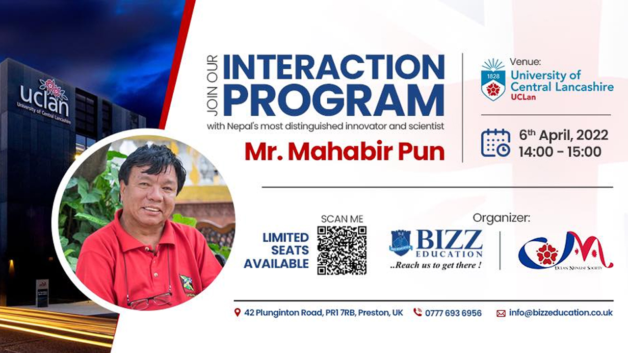 लण्डन । राष्ट्रिय आविष्कार केन्द्रका संस्थापक एवम् नेपाली वैज्ञानिक महाविर पुन मगर र युनिभर्सिटी अफ सेन्ट्रल लकांशायरका विज्ञहरुबीच अन्तरक्रिया हुने भएको छ । नेपाली विज्ञान र प्रविधि क्षेत्रको खोज तथा अनुसन्धान र सम्भावनाका बारेमा छलफल तथा अन्तरक्रिया कार्यक्रम आयोजना गरिएको कार्यक्रम सयोंजक एवम् बिज एजुकेशन कन्सलटेन्सीका प्रबन्ध निर्देशक हरी कार्कीले जानकारी दिए ।