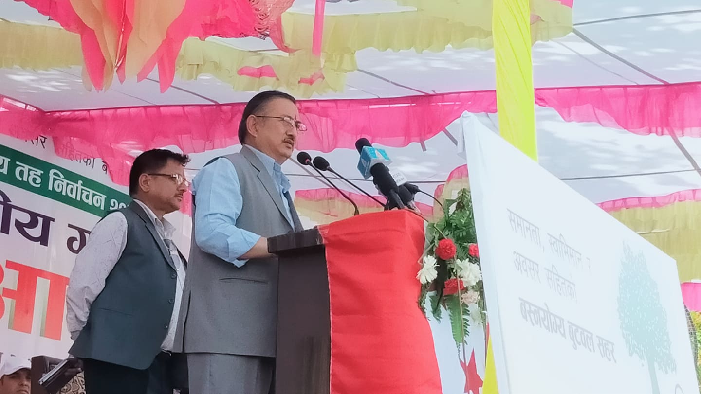 उहांले नेपाली राजनीतिमा शान्ति सम्झौता भएदेखि नै गठबन्धनको संस्कृति सुरु भएको र ओलीले दुई पटकसम्म संसद विघटन गरेपछि पुनः गठबन्धन भएको बताउनुभयो । उहाले रुपन्देही सहित देशभर गठबन्धनलाइ जिताउन आग्रह गर्नुभयो ।