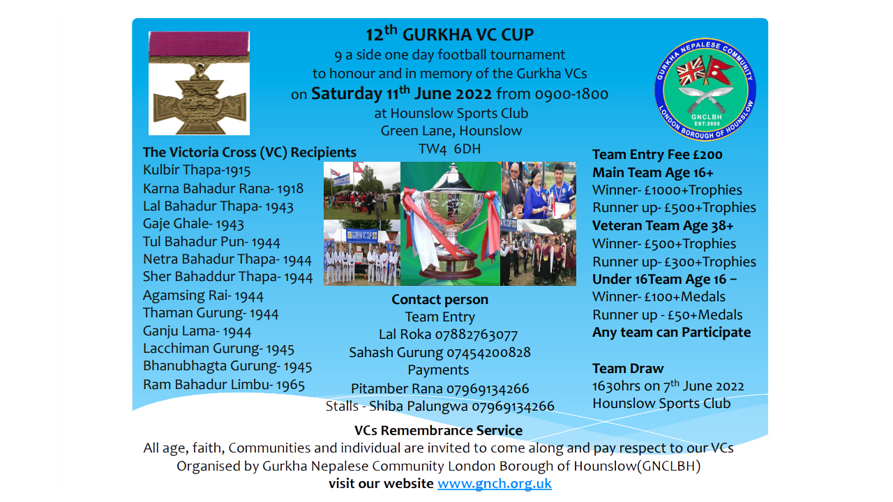 कार्यक्रम स्थल, मिति, समय र सम्पर्क: Venue: Hounslow Sports Club, Green Lane, Hounslow, TW4 6DH Date: 11th June 2022, Saturday Time: 9.00am Contact Details: President, Dol Malla: 07788 873278 General Secretary, Dhan Bahadur Sarki: 07909387460 Sport Secretary, Lal Roka: 07882 763077