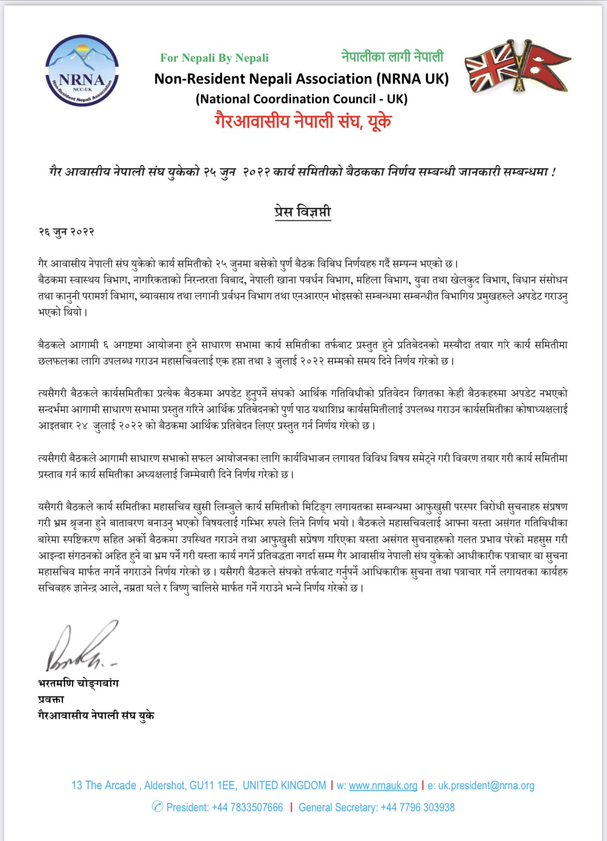 ‘महासचिव खुशी लिम्बुले कार्यसमितिको बैठक लगायतमा आफू खुशी परस्पर विरोधी सूचनाहरु संप्रेषण गरी भ्रम श्रृजना हुने वातावरण बनाउनु भएको विषयलाई गम्भीर रुपले लिने निणर्य भयो’, संघले आइतबार एक विज्ञप्तिमार्फत भनेको छ, ‘कार्यसमिति बैठकले महासचिवलाई आफ्ना यस्ता असंगत गतिविधिका बारेमा स्पष्टिकरणसहित अर्को बैठकमा उपस्थित गराउने तथा आफू खुशी सप्रेषण गरिएका यस्ता असंगत सूचनाहरुको गलत प्रभाव परेको महसुस गरी आइन्दा संगठनको अहित हुने वा भ्रम पर्ने गरी यस्ता कार्य नगर्ने प्रतिवद्धता नगर्दासम्म गैर आवासीय नेपाली संघ यूकेको आधिकारिक पत्राचार वा सूचना महासचिवमार्फत नगर्ने नगराउने निणर्य गरेको छ ।’
