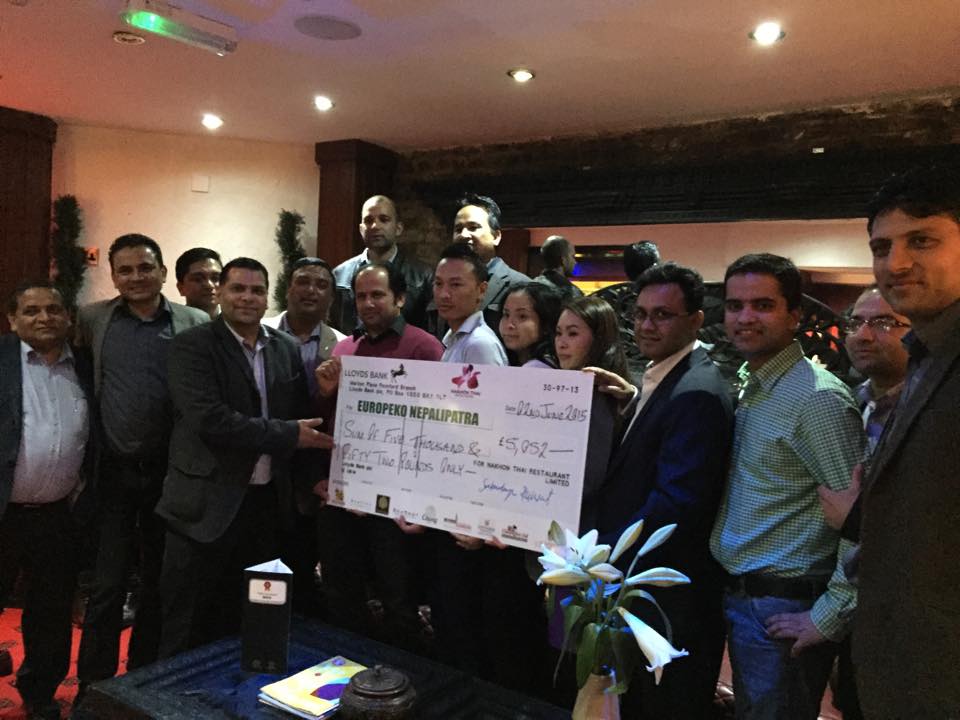 मंगलबार सांझ एल्थामस्थित याक एण्ड यति रेष्टुरेन्टमा बेलायतस्थित नेपाली समुदायका केही प्रतिनिधी तथा पत्रकारहरुमाझ सहयोग रकम रेष्टुरेन्टले नेपालीपत्रलाई हस्तान्तरण गरयो । सहयोगको चेक हस्तान्तरणका लागि नाकोन थाई कम्पनीका निर्देशकहरु शाह चौधरी, एमी साकुन्लया लगायत याक एण्ड यति पुगेका थिए । नेपालीपत्रका तर्फबाट सो पत्रिकाका निर्देशक समेत रहेका एनआरएन यूके अध्यक्ष महेन्द्र कंडेलले चेक बुझे ।