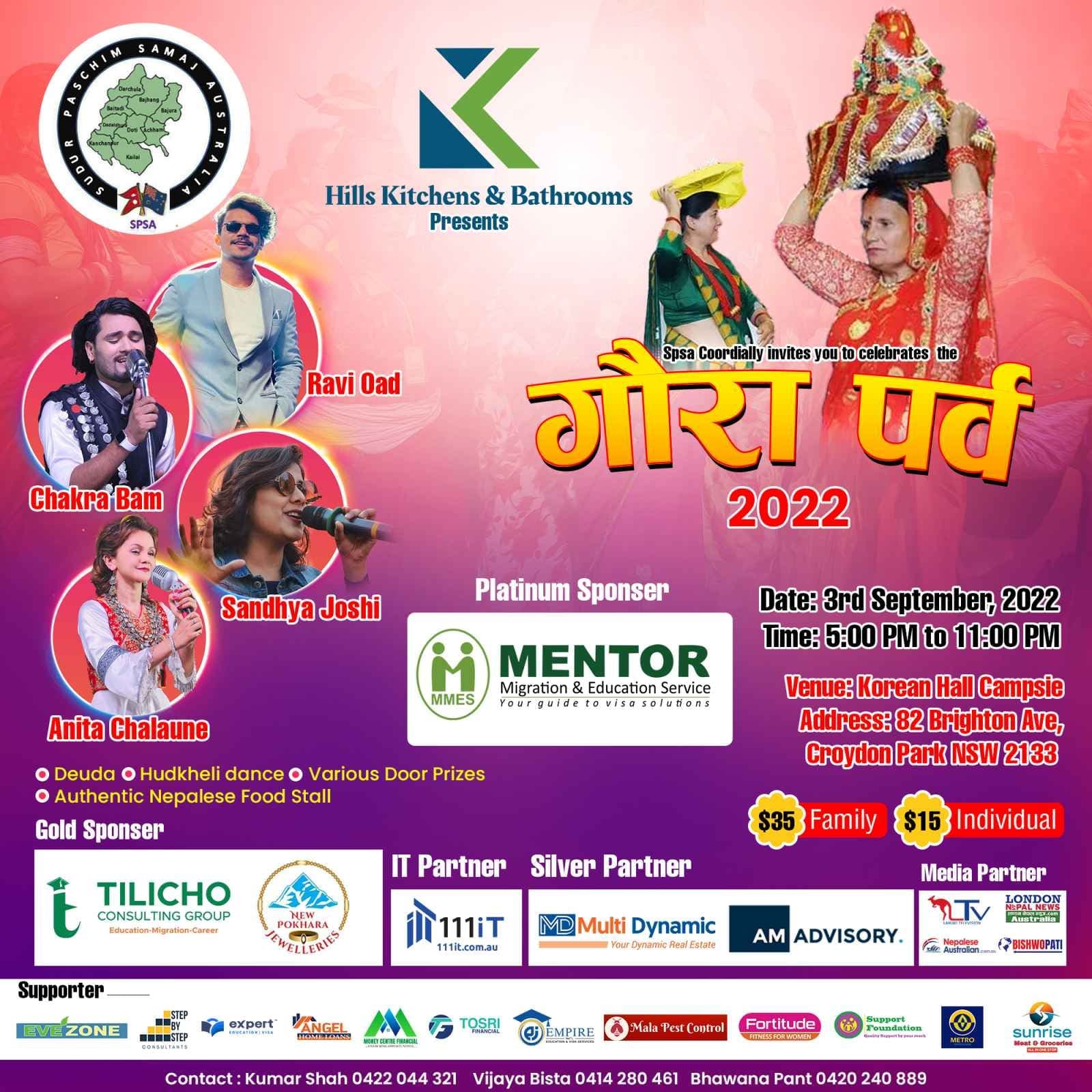 सिड्नी । सुदुरपश्चिम समाज अष्ट्रेलिया न्यू साउथ वेल्स राज्यले गौरा पर्व धुमधामका साथ मनाउने भएको छ ।  समाजले ३ सेप्टेम्बरमा न्यू साउथ वेल्स राज्य स्थित क्रोयडोन पार्कको कोरियन हलमा विविध सांस्कृतिक तथा मनोरञ्जनात्मक कार्यक्रम आयोजना गरेको छ ।