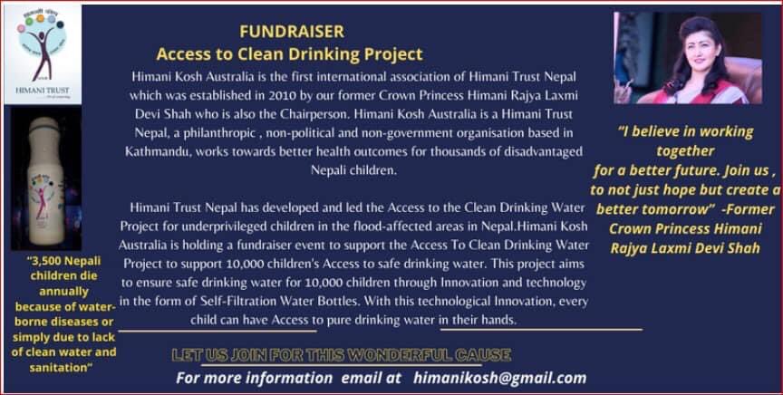 ट्रष्टले कोष सङ्कलनका लागि अगष्ट १० तारिखमा सिड्नीमा आयोजना गरेको ईभेन्ट्समा उनी सहभागी हुनेछिन् । हिमानी ट्रष्ट नेपालले नेतृत्व गरेको ‘एक्सेस टु क्लिन ड्रिङ्किङ वाटर प्रोजेक्ट’ लाई सहयोग गर्ने उद्धेश्यले ३ वटा छुट्टा छुट्टै कार्यक्रमको आयोजना गर्न लागिएको र उक्त कार्यक्रममा पूर्व युवराज्ञी हिमानी शाह पनि सहभागी हुने हिमानी ट्रष्ट अष्ट्रेलियाकी अध्यक्ष अञ्जना बस्नेत कार्कीले जानकारी दिईन् ।
