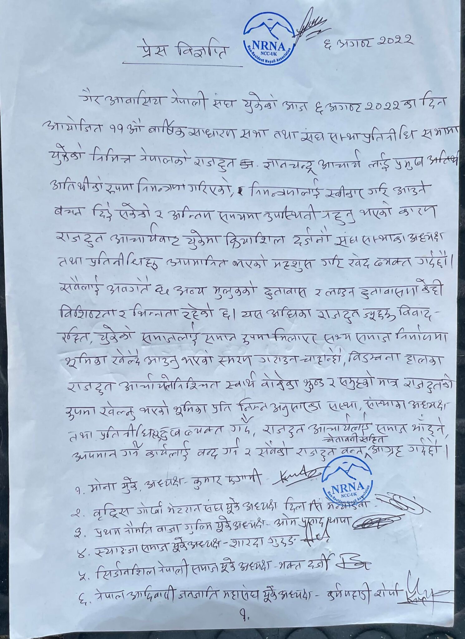 एनआरएनए यूके कार्यक्रममा अनुपस्थित राजदूतप्रति तीन दर्जन संस्थाद्वारा खेद प्रकट (वक्तव्य)