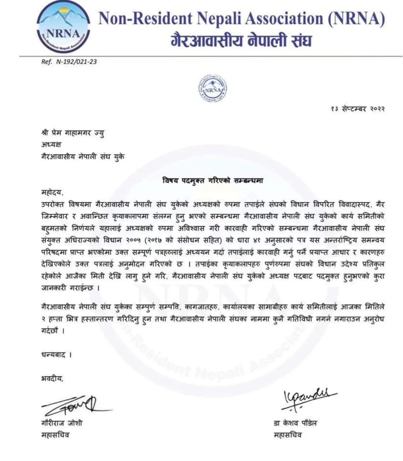 एनआरएन यूके अध्यक्ष प्रेम गाहालाई आइसीसीले पदमुक्त पत्र लेखे पछि पत्र नमान्ने भन्दै दिए अर्को चुनौती