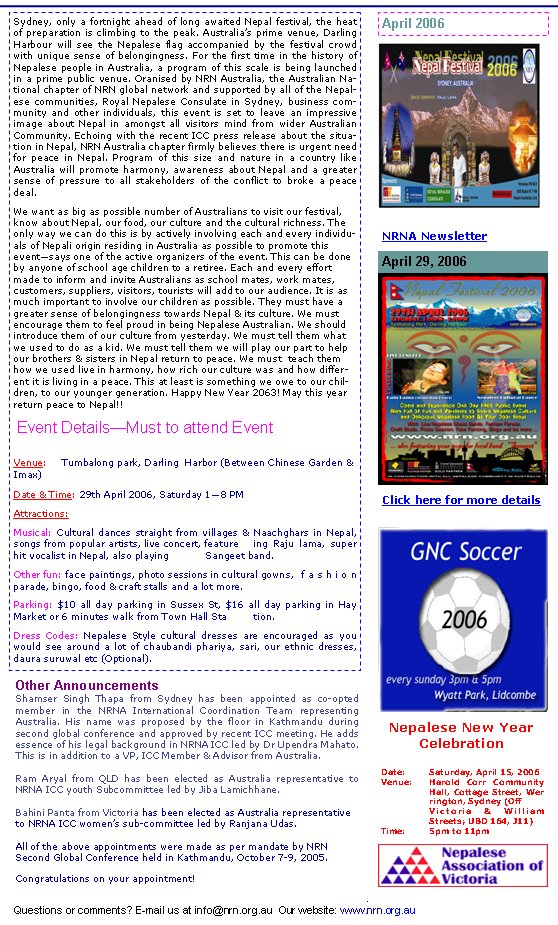 उनको परिकल्पनालाई तत्कालिन एनआरएनएका पदाधिकारीहरुले पनि निकै साथ दिए । सोही अनुसार सन् २००६ मा सिड्नीमा नेपाल फेस्टिबल सिड्नीको आयोजना गरियो । कार्यक्रमले सफलता लिएपछि पहिलो कार्यक्रमको रुपमा सिड्नीबाट सुरु गरिएको फेस्टिबलले निकै नै मान्छेहरुलाई आकर्षित गर्यो ।