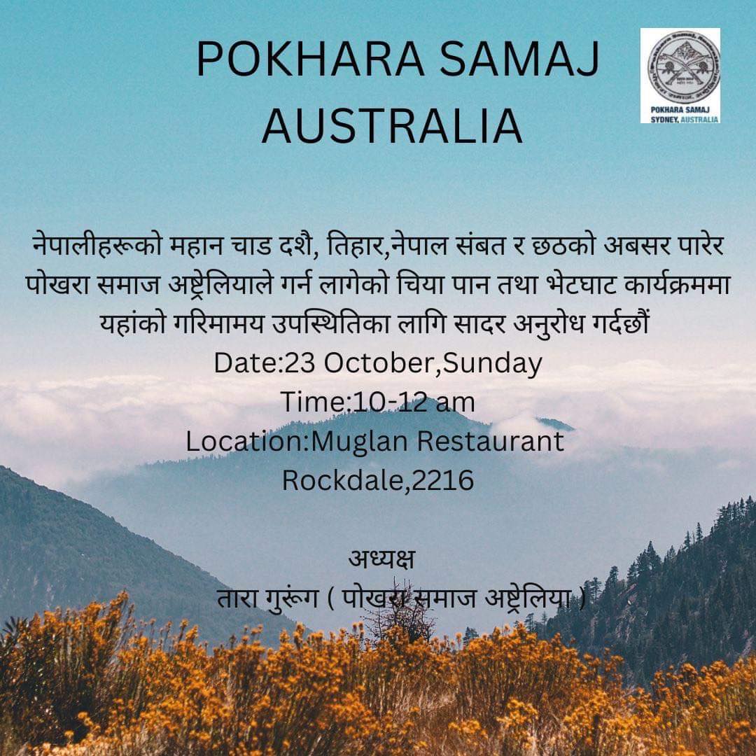 सिड्नी । नेपालीहरुका महत्वपूर्ण चाडपर्वको अवसर पारेर पोखरा समाज अस्ट्रेलियाले चियापान तथा भेटघाट र शुभकामना आदान प्रदान गर्ने भएको छ ।