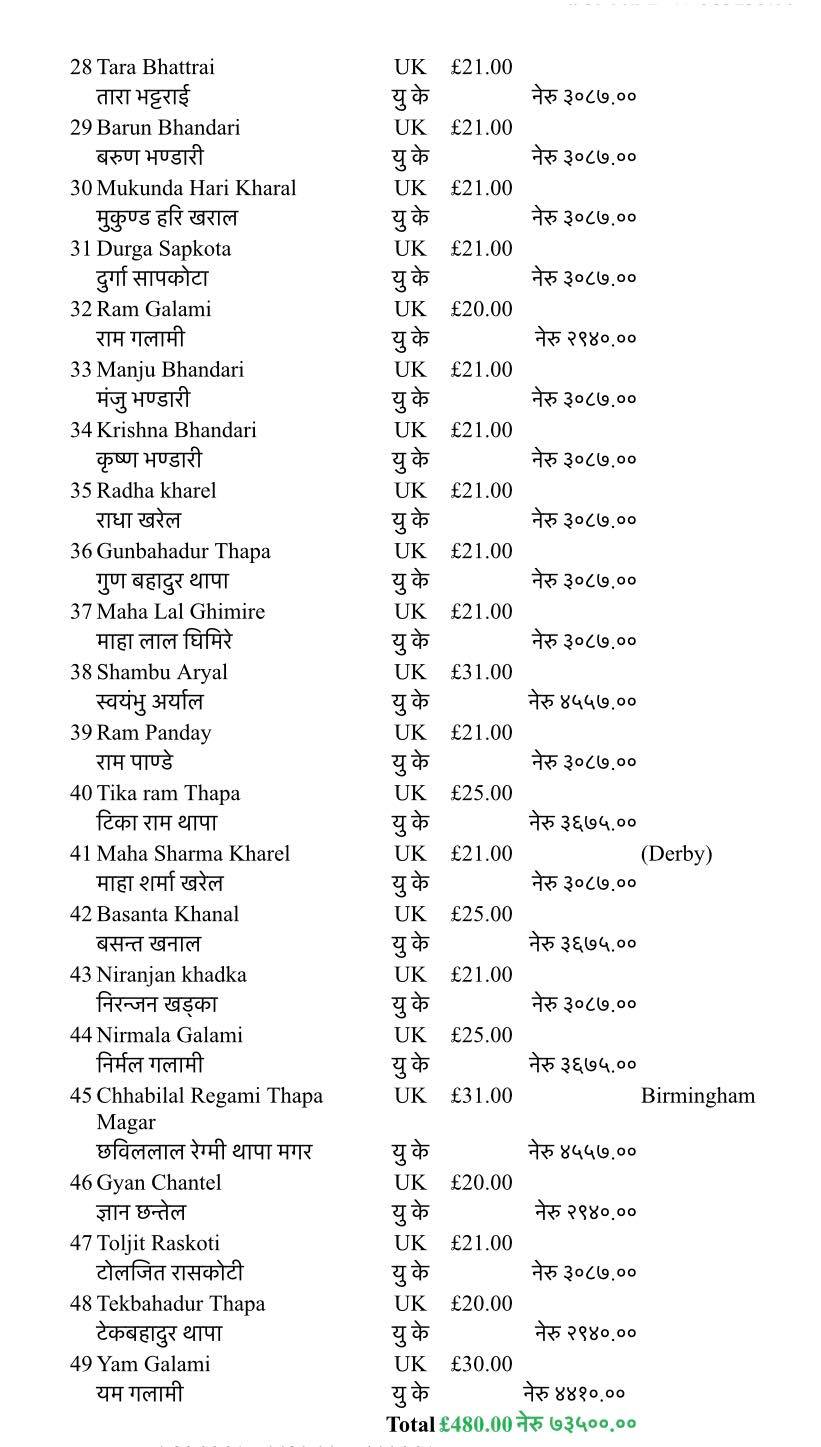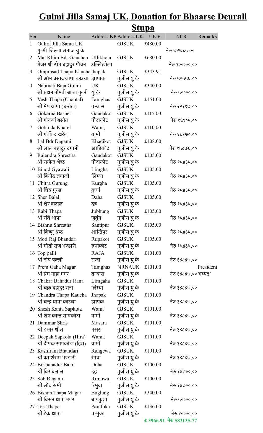 स्तूपा निर्माणका लागि सहयोग सकलन अभियानमा संस्थापक अध्यक्ष ओम थापा काउचा सल्लाहकारहरू मिन दर्लामी, बिन भुजेल, कोषाध्यक्ष मुकुन्द खरेल लगायतलाई जिम्मेवारी दिईएको थियो । बेलायतमा रहेका नेपालीहरुको अग्रणी मध्येको पनि अग्रणी संस्था गुल्मी जिल्ला समाज युकेले गृह जिल्लामा विभिन्न विपत्ति, भैपरि तथा अफ्ठ्यारोमा अभिभावकीय जिम्मेवारी पुरा गर्दै विभिन्न सहयोग गर्दै आईरहेको छ ।कसले के कति गरे सहयोग नाम र रकम सहित