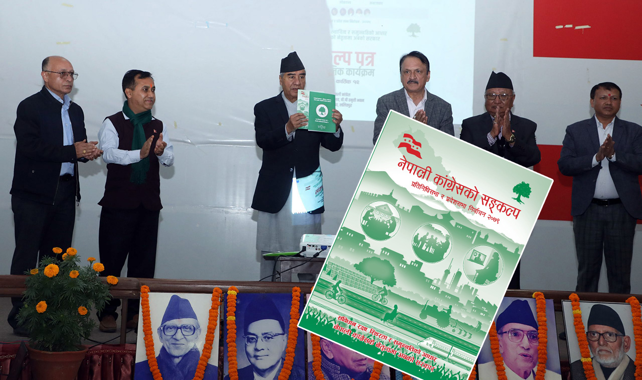 काठमाडौँ । नेपाली कांग्रेसले आगामी मङ्सिर ४ गते हुने प्रतिनिधिसभा र प्रदेशसभा सदस्य निर्वाचनका लागि पार्टीको संकल्पपत्र सार्वजनिक गरेको छ । प्रधानमन्त्री एवं कांग्रेसका सभापति शेरबहादुर देउवाले आज पार्टी केन्द्रीय कार्यालयमा आयोजित एक कार्यक्रममा उक्त संकल्पपत्र सार्वजनिक गरे ।