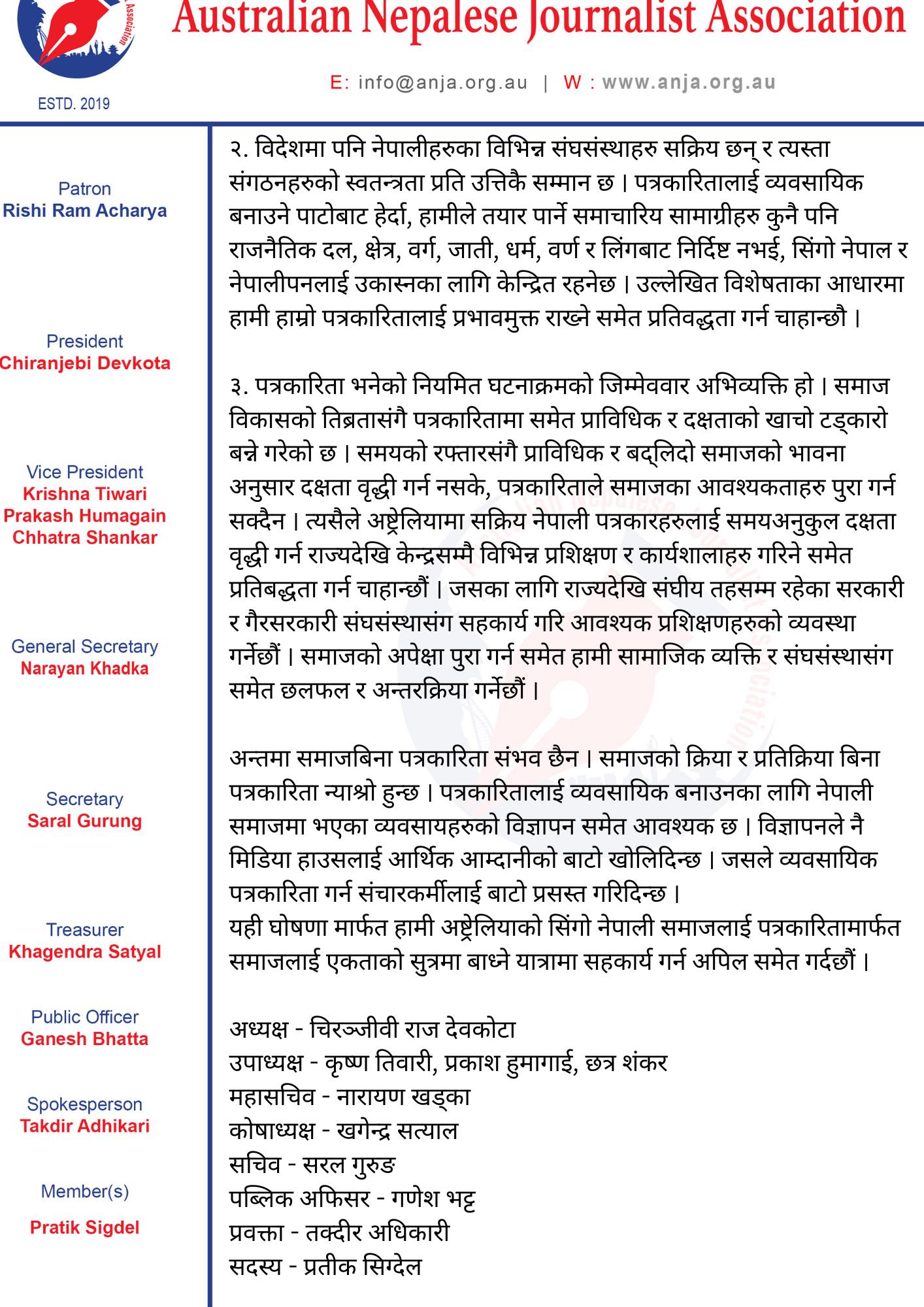 ३. पत्रकारिता भनेको नियमित घटनाक्रमको जिम्मेववार अभिव्यक्ति हो । समाज विकासको तिब्रतासंगै पत्रकारितामा समेत प्राविधिक र दक्षताको खाचो टड्कारो बन्ने गरेको छ । समयको रफ्तारसंगै प्राविधिक र बद्लिदो समाजको भावना अनुसार दक्षता वृद्धी गर्न नसके, पत्रकारिताले समाजका आवश्यकताहरु पुरा गर्न सक्दैन । त्यसैले अष्ट्रेलियामा सक्रिय नेपाली पत्रकारहरुलाई समयअनुकुल दक्षता वृद्धी गर्न राज्यदेखि केन्द्रसम्मै विभिन्न प्रशिक्षण र कार्यशालाहरु गरिने समेत प्रतिबद्धता गर्न चाहान्छौं । जसका लागि राज्यदेखि संघीय तहसम्म रहेका सरकारी र गैरसरकारी संघसंस्थासंग सहकार्य गरि आवश्यक प्रशिक्षणहरुको व्यवस्था गर्नेछौं । समाजको अपेक्षा पुरा गर्न समेत हामी सामाजिक व्यक्ति र संघसंस्थासंग समेत छलफल र अन्तरक्रिया गर्नेछौं ।