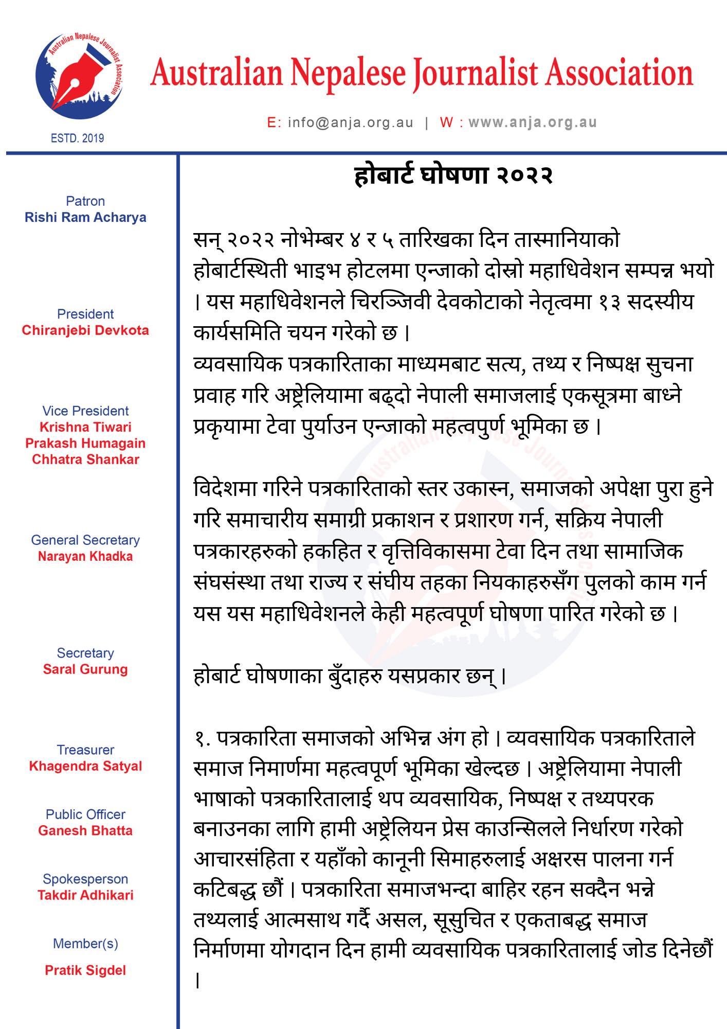 नोभेम्बर ४ र ५ तारिखका दिन तास्मानियाको होबार्टस्थिती भाइभ होटलमा सम्पन्न एन्जाको दोस्रो महाधिवेशन पछि निर्वाचित कार्यसमितिको पहिलो बैठकले ३ बुँदे होबार्ट घोषणा पत्र जारी गरेको हो ।