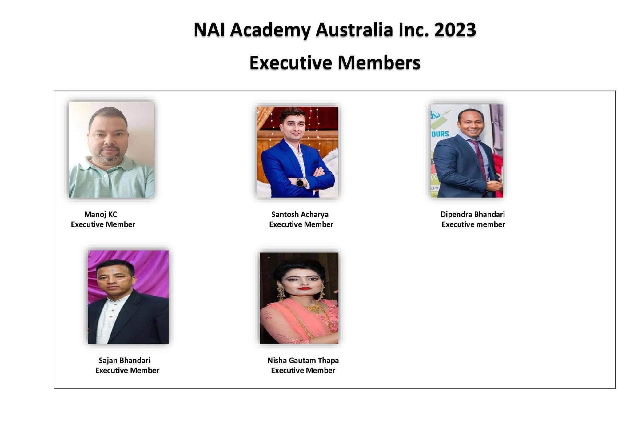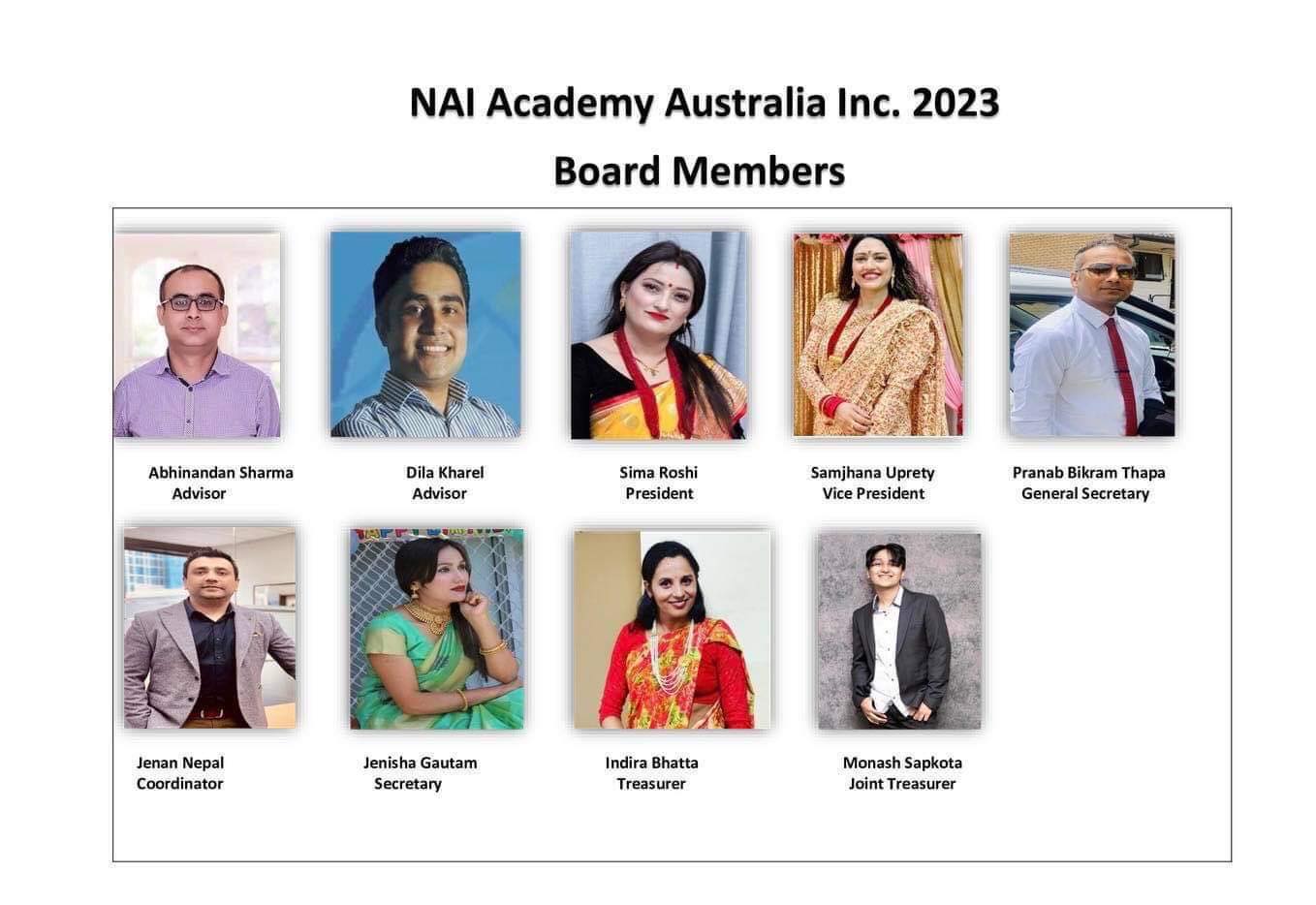 १२ डिसेम्बर २०२२ फुल्टन एभिन्यू वेंटवर्थभिलमा सम्पन्न भेलाले नइ एकेडेमी अस्ट्रेलियाको संस्थापक समितिमा ६ जना चयन गरेको छ ।जसको अध्यक्षमा सिमा रोसी, उपाध्यक्षमा सम्झना उप्रेति, महासचिवमा प्रणाव विक्रम थापा, कोषाध्यक्षहरुमा इन्दीरा भट्ट, सन्तोष सापकोटा र रनीशा गौतम थापा लगायत रहेका छन् ।