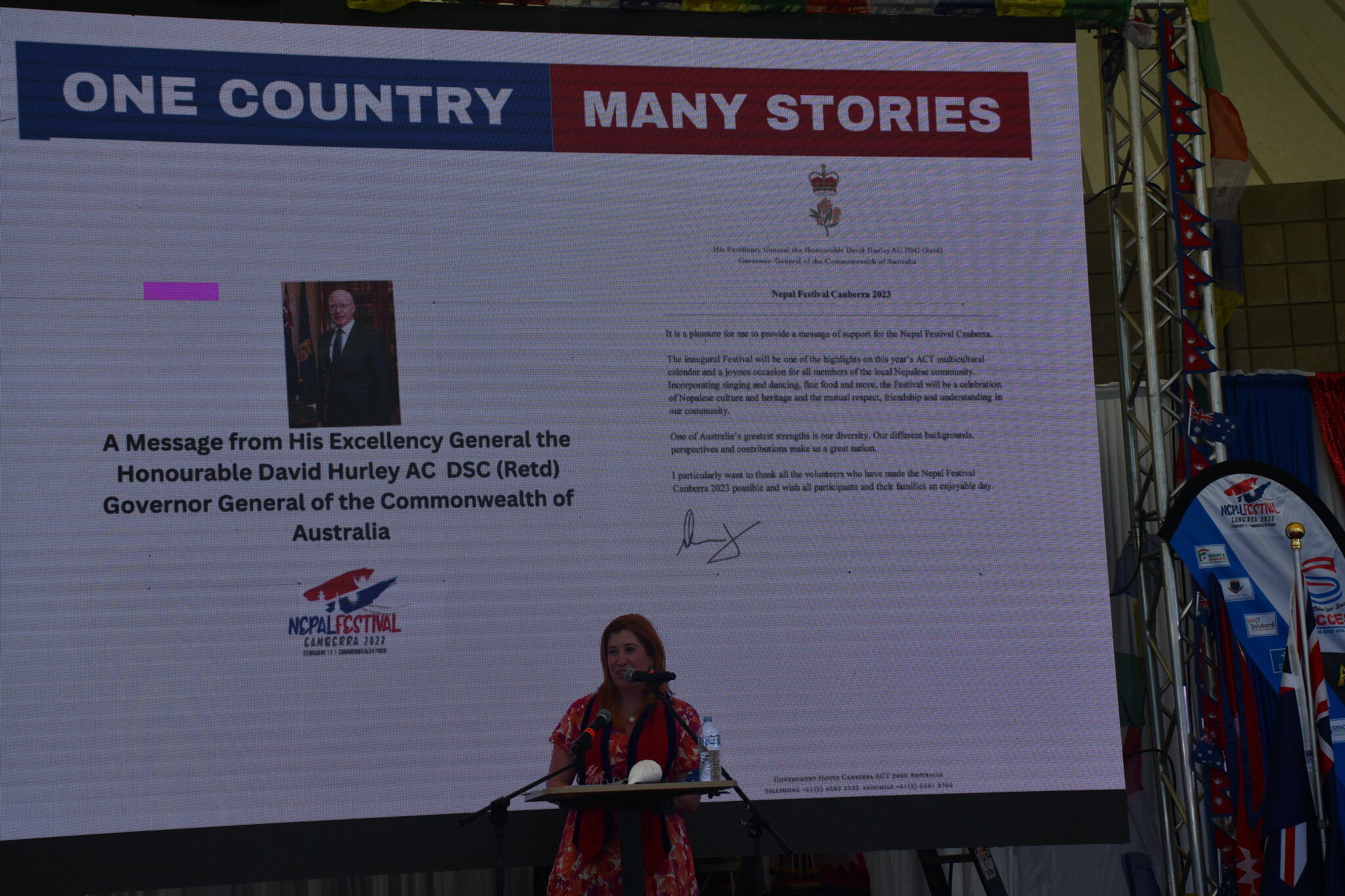 कार्यक्रमका प्रमुख अतिथि अष्ट्रेलियाका लागि नेपाली राजदूत कैलाशराज पोखरेलले सम्बोधन गर्दै एनआरएनएनले आयोजना गरेको नेपाली फेस्टिवलले अष्ट्रेलियामा नेपाली भाषा, कला, संस्कृतिको प्रवद्र्धनका निम्ती महत्वपूणर् रहेको बताए । अष्ट्रेलियन समुदायमा बढ्दै गइरहेको नेपाली जनसंख्यालाई मध्यनजर गर्दै यसप्रकारका सांस्कृतिक पर्वले नेपाली पहिचान र मौलिकताको विकासमा टेवा पुग्ने मात्र नभएर नेपालमा पर्यटन प्रर्वद्धनमा पनि भूमिका खेल्ने उनको भनाई थियो ।