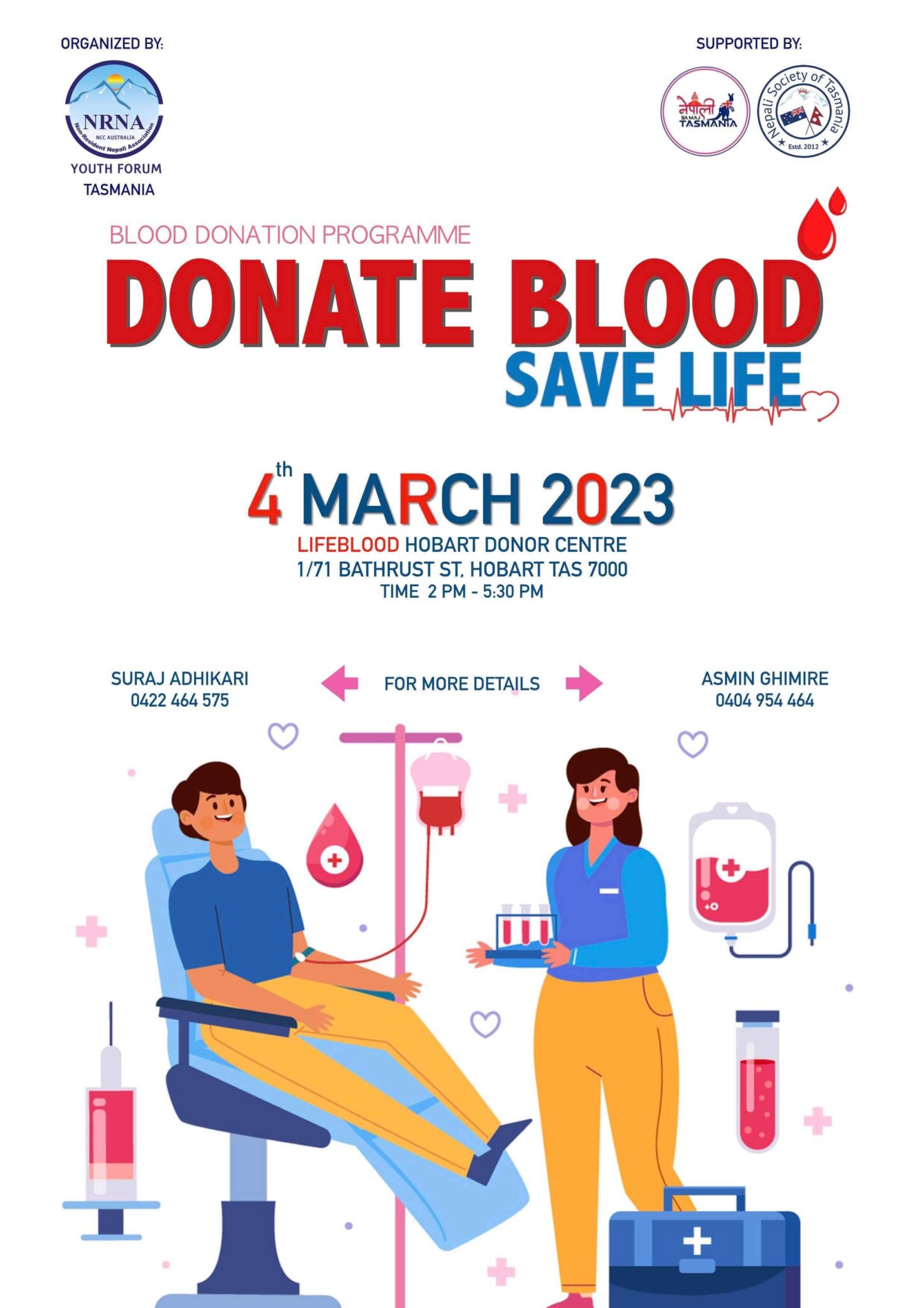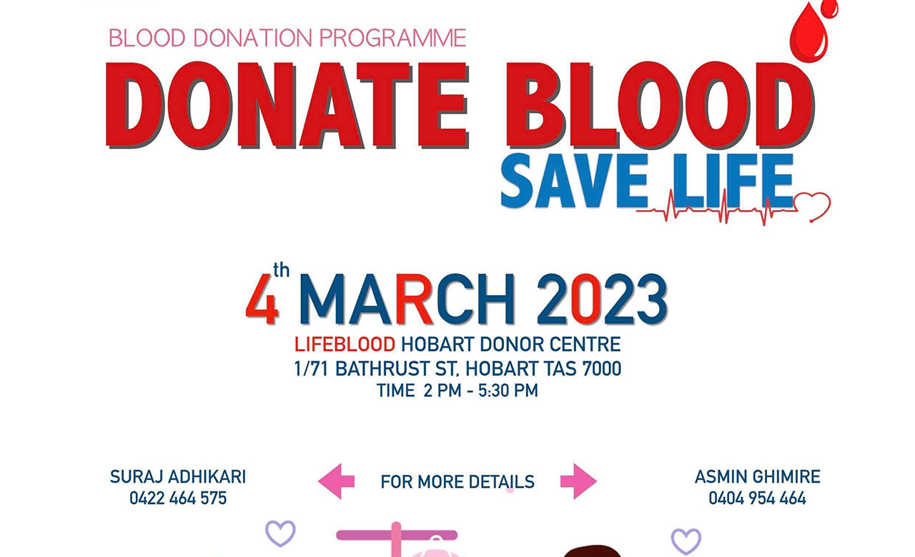 सिड्नी । एनआरएनए ताज्मानिया राज्य परिषद युथ फोरमले रक्तदान कार्यक्रम गर्ने भएको छ । नेपाली समुदायका व्यक्तिहरुको उपस्थितिमा फोरमले आगामी मार्च ४ तारिख लाईफब्लड होबर्ट डोनर सेन्टरमा रक्तदान कार्यक्रमको आयोजना गरेको छ ।
