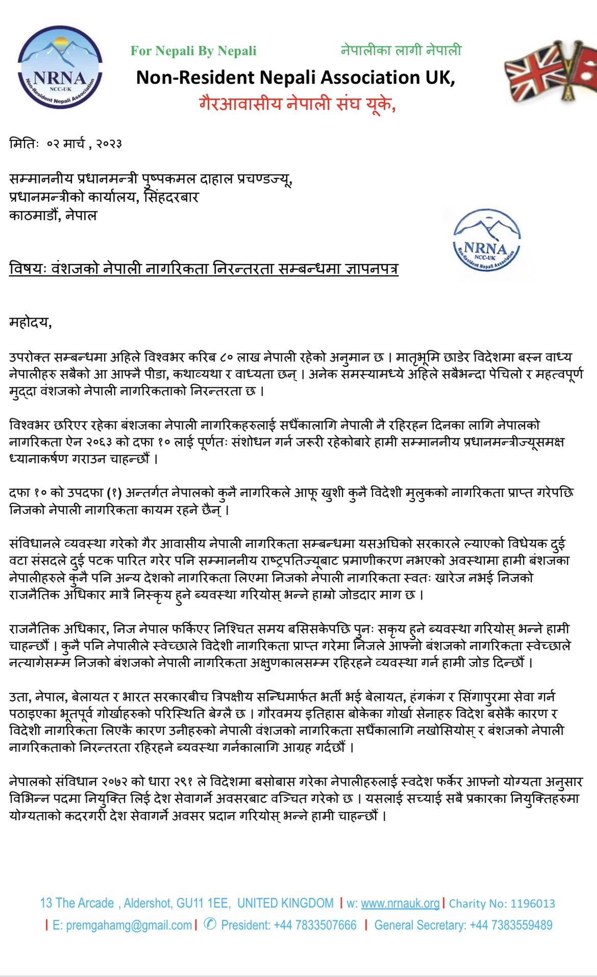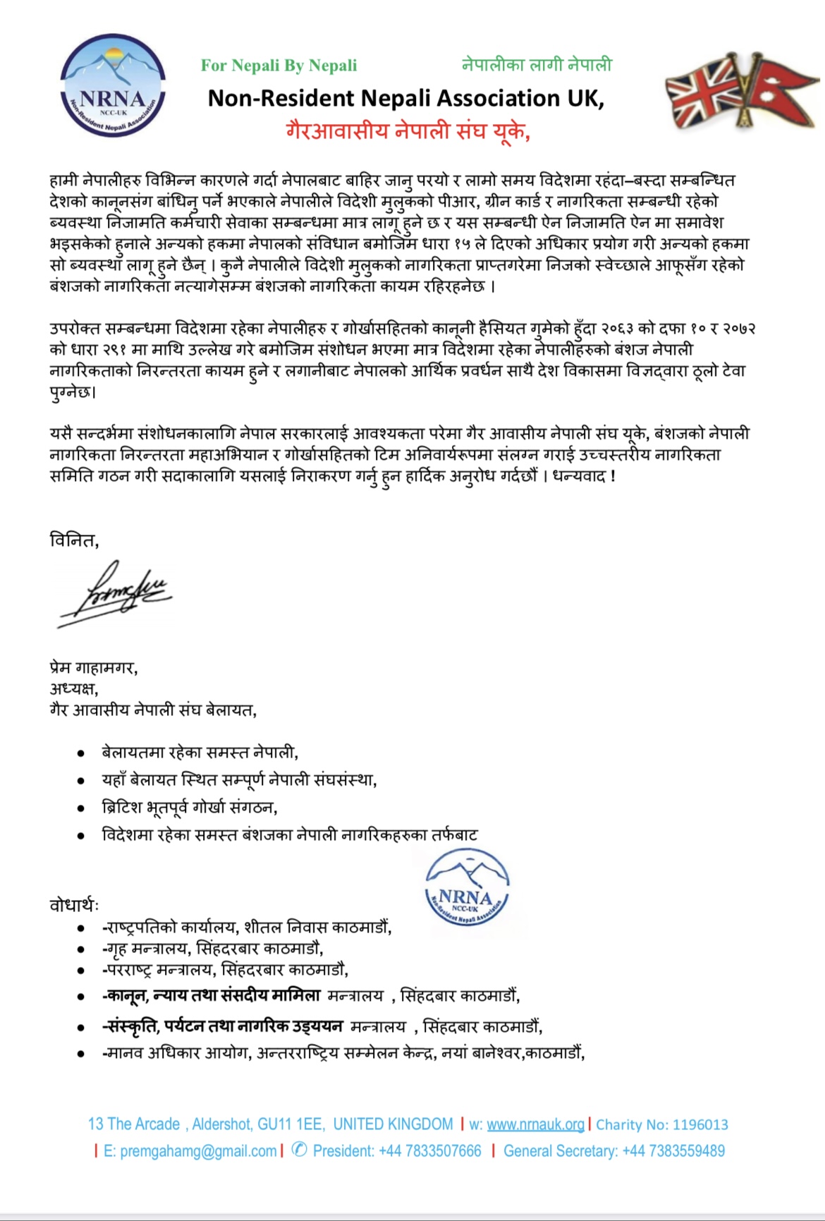 अध्यक्ष गाहामगरले विश्वभर छरिएर रहेका बंशजका नेपाली नागरिकलाई सधैंकालागि नेपाली नै रहिरहन दिनका लागि नेपालको नागरिकता ऐन २०६३ को दफा १० लाई पूर्णतः संशोधन गर्न जरूरी रहेकोबारे प्रधानमन्त्रीको ध्यानाकर्षण