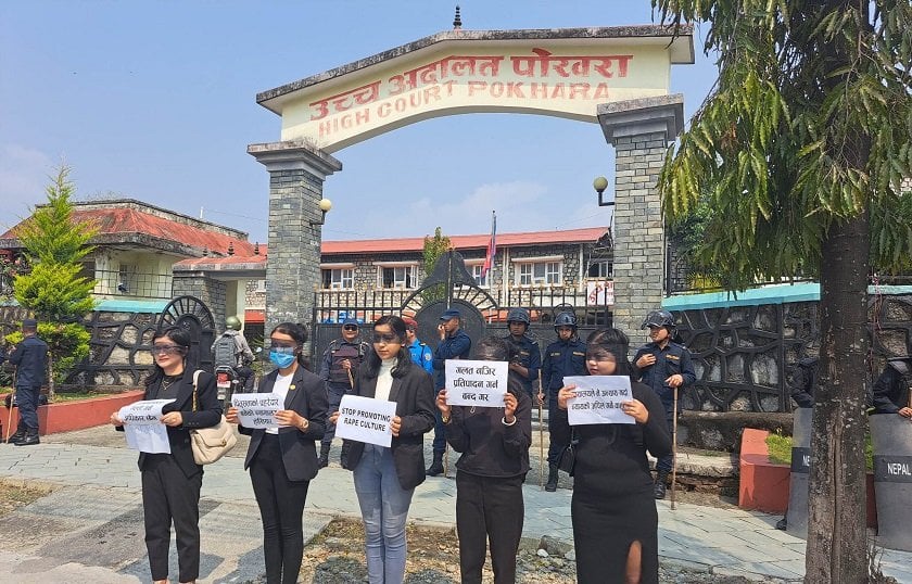 पल शाहलाई सफाइ दिएको विरोधमा उच्च अदालत पोखरा बाहिर प्रदर्शन