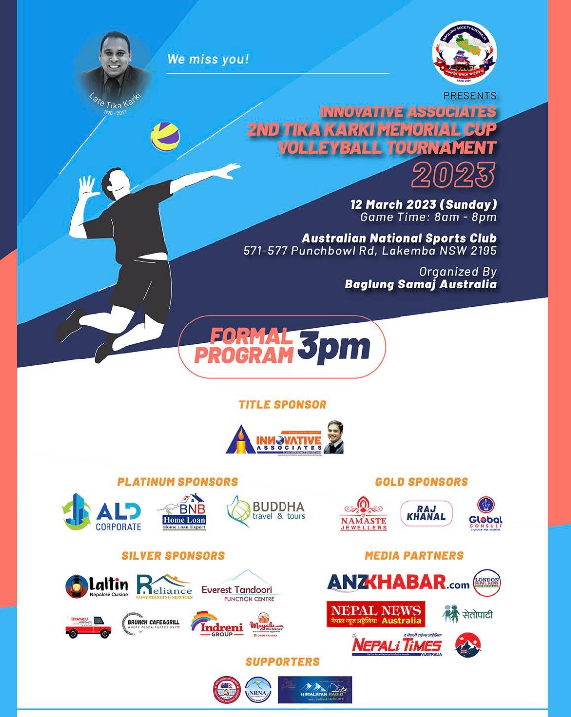सिड्नी । बागलुङ समाज अस्ट्रेलियाले स्वं पत्रकार टिका कार्कीको सम्झनामा दोश्रो टिका कार्की स्मृति कप भलिबल प्रतियोगीता आयोजना गर्ने भएको छ । विगतका वर्षमा जस्तै यस वर्ष पनि समाजले अस्ट्रेलियन नेसनल स्पोर्ट्स क्लवमा यही मार्च १२ तारिख आईतबार प्रतियोगीता गर्दैछ ।
