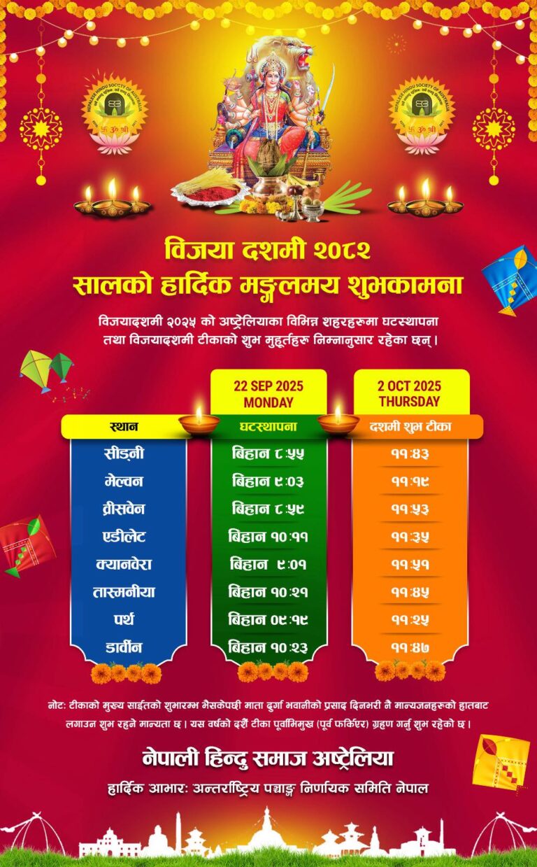 सिड्नी । नेपाली हिन्दु समाज अष्ट्रेलियाले विभिन्न शहरहरुमा यसवर्षको घटस्थापना र विजयादशमी टीकाको शुभसाइत सार्वजनिक गरेको छ ।…