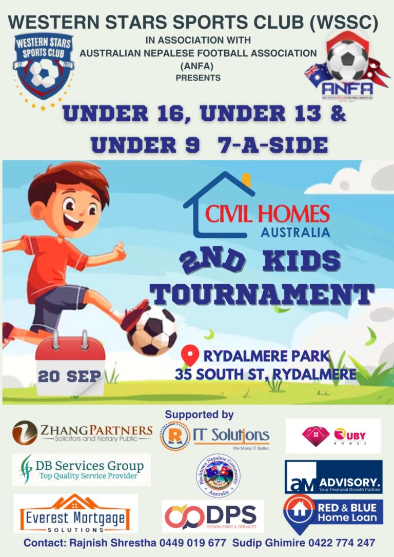 सिड्नी। वेस्टर्न सिड्नी स्पोर्ट्स क्लबले दोस्रो बालबालिकाको फुटबल प्रतियोगिता २० सेप्टेम्बर शनिबार आयोजना गर्ने भएको छ। यस प्रतियोगिताले…