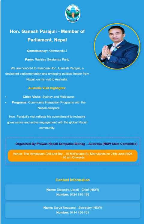 सिड्नी । राष्ट्रिय स्वतन्त्र पार्टी (रास्वपा)बाट निर्वाचित सांसद गणेश पराजुली अस्ट्रेलिया आईपुगेका छन् । पार्टीको स्थापना दिवसको अवसरमा…