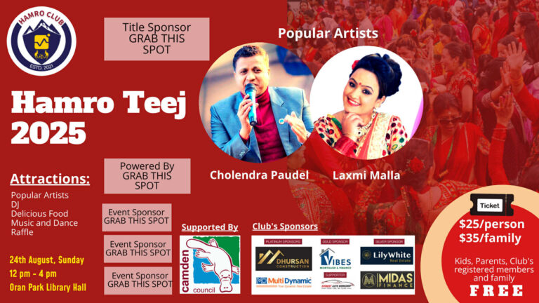सिड्नी । हाम्रो क्लव अस्ट्रेलियाले तीजको अवसरमा पारेर ओरन पार्क लाइब्रेरी हलमा हाम्रो तीज कार्यक्रम गर्ने भएको छ …