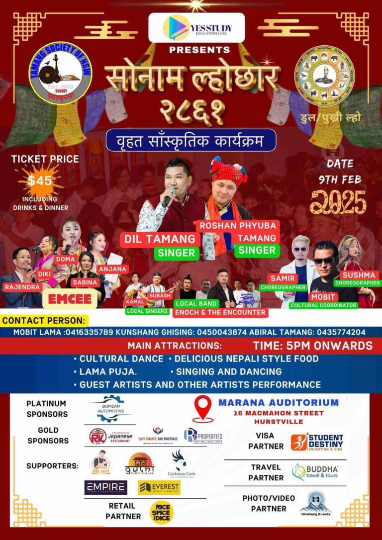 सिड्नी । तामाङ समुदायहरुको महत्वपूर्ण चाड सोनाम ल्होछार अस्ट्रेलियाको सिड्नीमा पनि भव्य रुपमा मनाईने भएको छ । तामाङ…