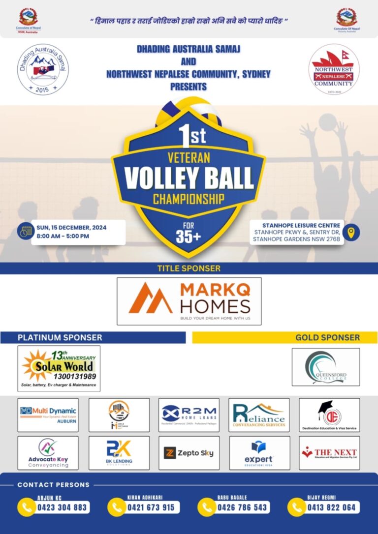 सिड्नी । अस्ट्रेलियाको सिड्नीमा ३५ वर्ष माथि उमेर समुहको भेट्रान भलिबल च्याम्पियनसिप हुने भएको छ । धादिङ समाज…